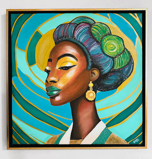 Bildtitel: „Madame Deco“, Mischtechnik, 60 x 60 cm, auf Leinwand, gerahmt.