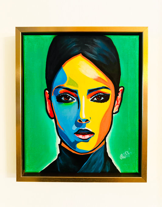 Bildtitel: „Frau farbenfroh 3.0“, Mischtechnik, Leinwand, Format: 25 x 30 cm, gerahmt.
