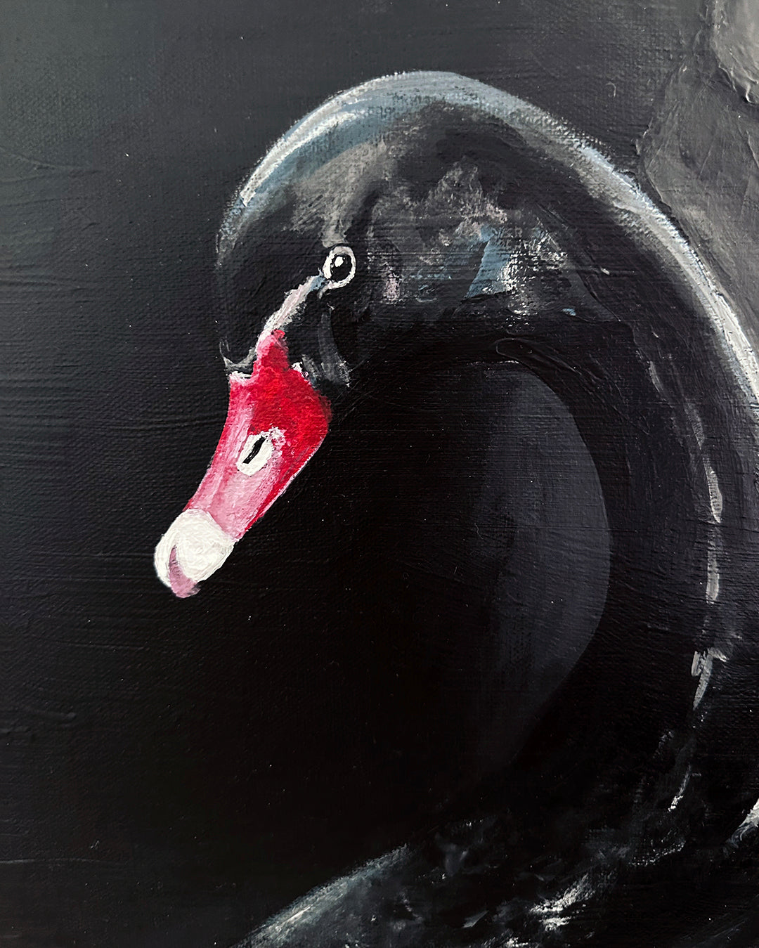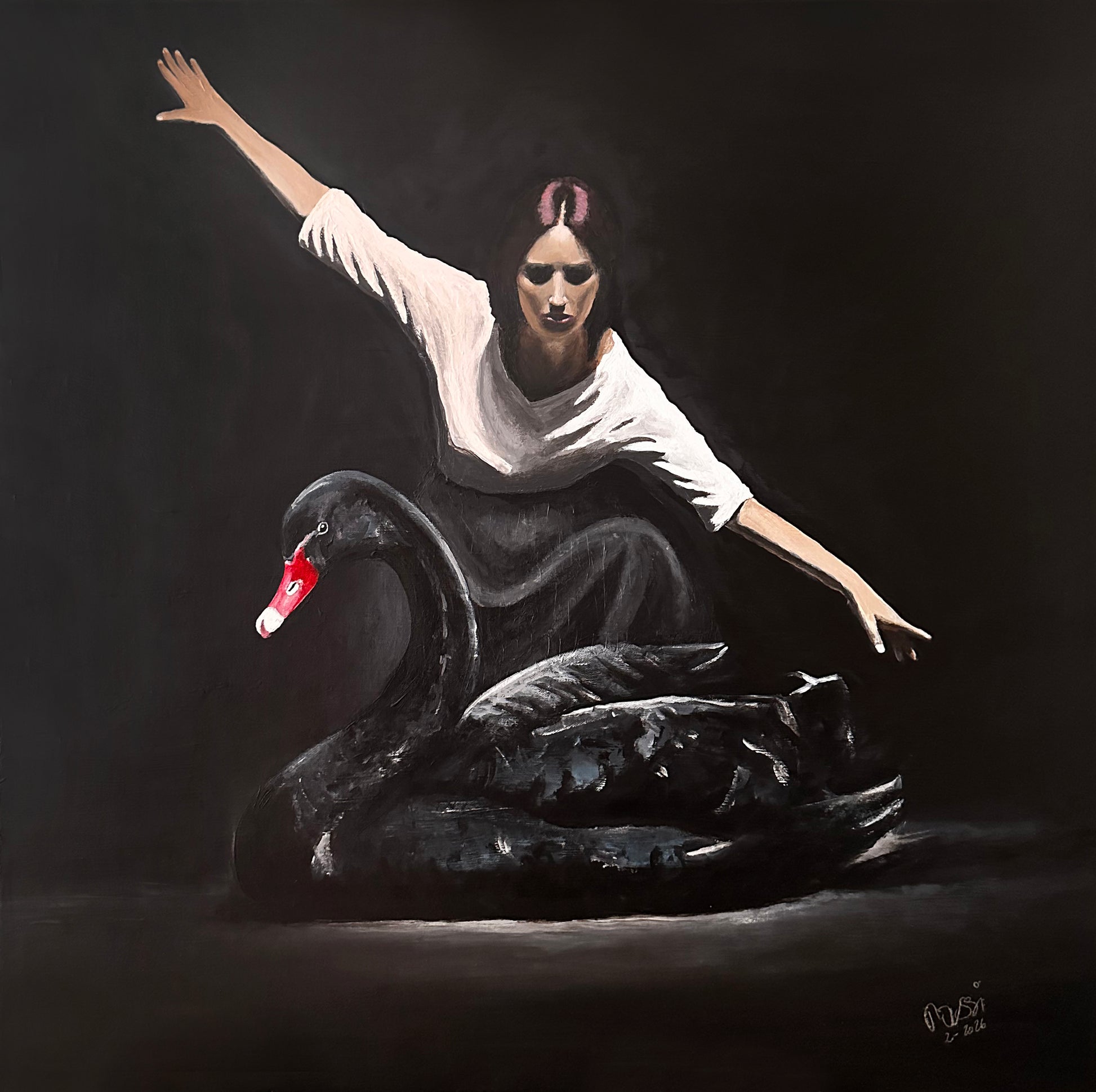 In „Der Flügelschlag“ verschmelzen Mensch und Tier auf einer szenischen Bühne zu einer Einheit. Während der Schwan eine tiefe, meditative Ruhe ausstrahlt, kniet die Frau in spannungsvollem Kontrast dazu. In der Nachahmung seines Flügelschlags entsteht ein Moment, in dem die Identitäten verschwimmen und beide vollkommen gleichwertig in Erscheinung treten. Durch die Wucht der Hell-Dunkel-Kontraste wachsen beide Figuren direkt aus der Schwärze heraus, was die subtile Spannung dieser Begegnung unterstreicht. Es ist, als würde der Mensch die instinktive Kraft der Natur verkörpern